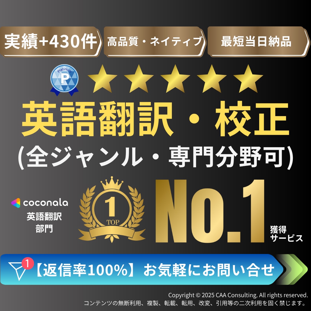英検1級プロ翻訳家が日本語⇆英語迅速に翻訳します プロ品質でスピーディーな翻訳サービス | ココナラ ★by Sarah★翻訳カテゴリー(英語)で数年間連続で1位になりました!(更新:2025年1月)ココナラでの翻訳実績1,300件以上ございます。◎ご依頼の際は...